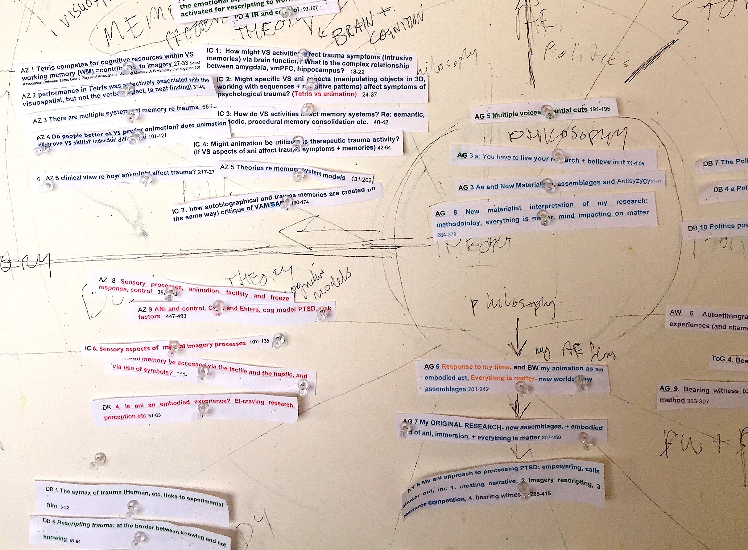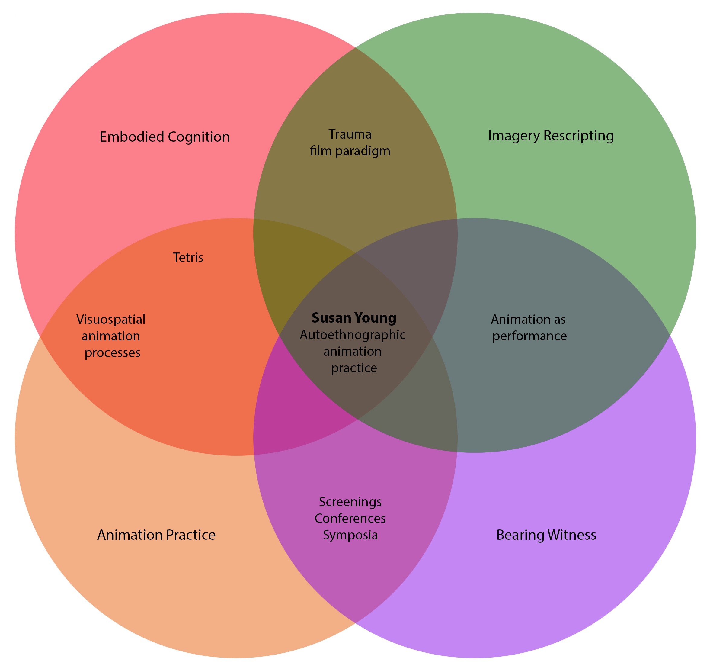 The methodology integrates cognitive science research into intrusive memories (studies show that visuospatial processes like Tetris gameplay can reduce trauma symptoms), with an agential realist philosophical framework, and autoethnographic practice (using personal experience to examine social, cultural, and political issues). The output includes a written text incorporating thematic analysis of interviews with animators, therapists, clinicians, scientists, and an autoethnographer, and two animated experiments that use my medicolegal and psychiatric records as source material.